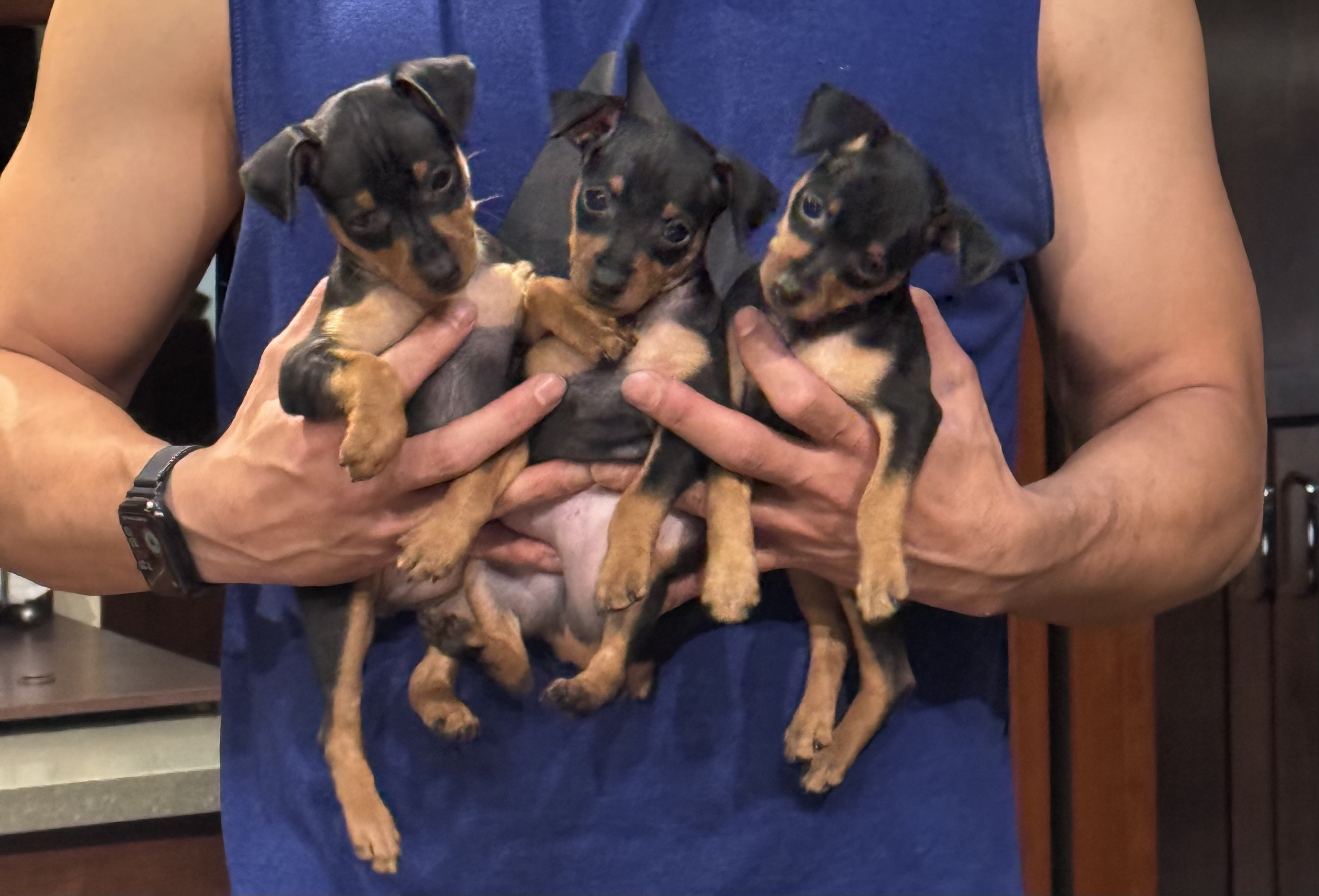 We have two Minature Pincher boys available. This was our first litter of Min Pins. They are so much fun and have a more "up" personality than Norwich. They make great house dogs.
